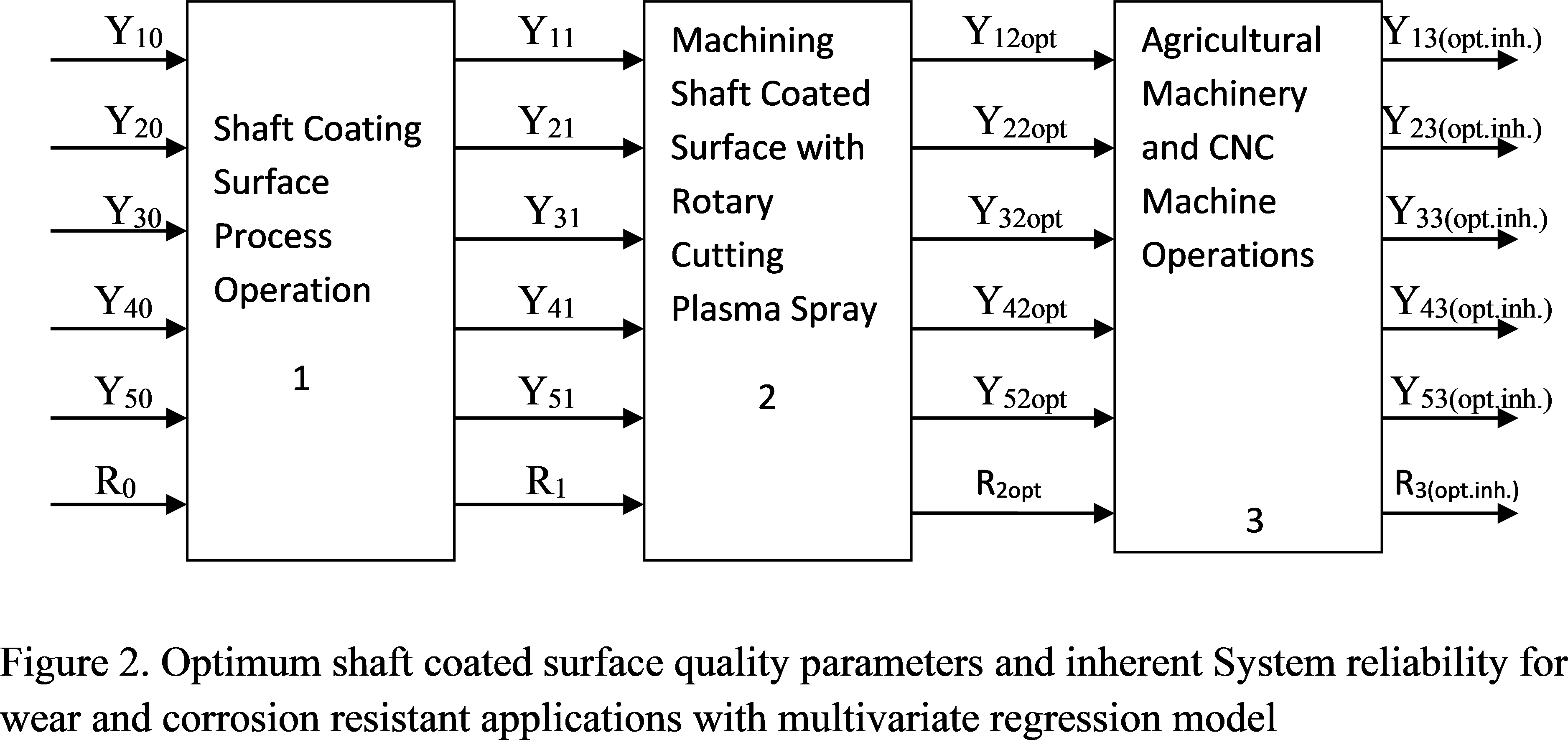 A United Nations panel held in 2008 concluded that “the way the world grows its food will have to change radically to cope with growing population and climate change”. It is also worthy of note that, we have been consuming more food than farmers have been producing for most of the past decade. Researchers have concluded that in order to meet the rising food demand, we need another green revolution technology and we need it in half the time. It therefore means the incorporation of new technologies, such as precision farming machines, agricultural robotics, technological inheritance technique and cost-effective sensors into agricultural production system, not only benefits productivity and environmental conditions, but it also improves the working conditions of farm managers, laborers and machinery operators as well as manufacturers that form the base for optimum production, operation and maintenance requirements. This is the essence of developing a multivariate reliability sensor for CNC Machines, Tractors and Agricultural Machinery with a cost-effective condition monitoring and maintenance strategy towards a successful agricultural production. This strategy helps to guarantee the safety of operations, availability of machines, spare parts and related equipment for cultivation operation. The increased competition in agricultural production demands maintenance improvement, that aims at the reduction of maintenance expenditures, while keeping the safety of operations throughout the life cycle of a cnc machine and agricultural machinery. The first step of this design consists of the concept of a mathematical multivariate regression model for the machining process operations of hard alloy machine part surface (Yi) and the optimization of the operating machining performance process using rotary cutting tool with plasma spray (Xi) for wear and corrosion resistant applications as shown in Fig.1,3. A multivariate regression model is used to describe the process as shown in a system of equations [1]. The second step is generating the optimum (Yiopt.) and (Xiopt.) data for condition monitoring, preventive, predictive and proactive maintenance strategies as well as design of multivariate reliability sensor from a current signal as well as with the help of technological inheritance technique. The third step is the relationship between the cnc machines, workpiece, material and the working toll system for advanced/modern manufacturing technology, tractors and agricultural machinery system with the application of a multivariate reliability sensor and technological inheritance model. Technological Inheritance Technique is the transfer of the properties of an object or component from the initial stage of technological process to its final stage in a technological system as well as within a process operation. Technological inheritance model is used to relate and integrate the cnc machine, workpiece, material and cutting tool system with tractor and machinery system. It is also used to design a multivariate reliability sensor and process condition monitors for a cost-effective maintenance in cnc machines, tractors and agricultural machinery as seen in Figures 2, 4 and Table 1.